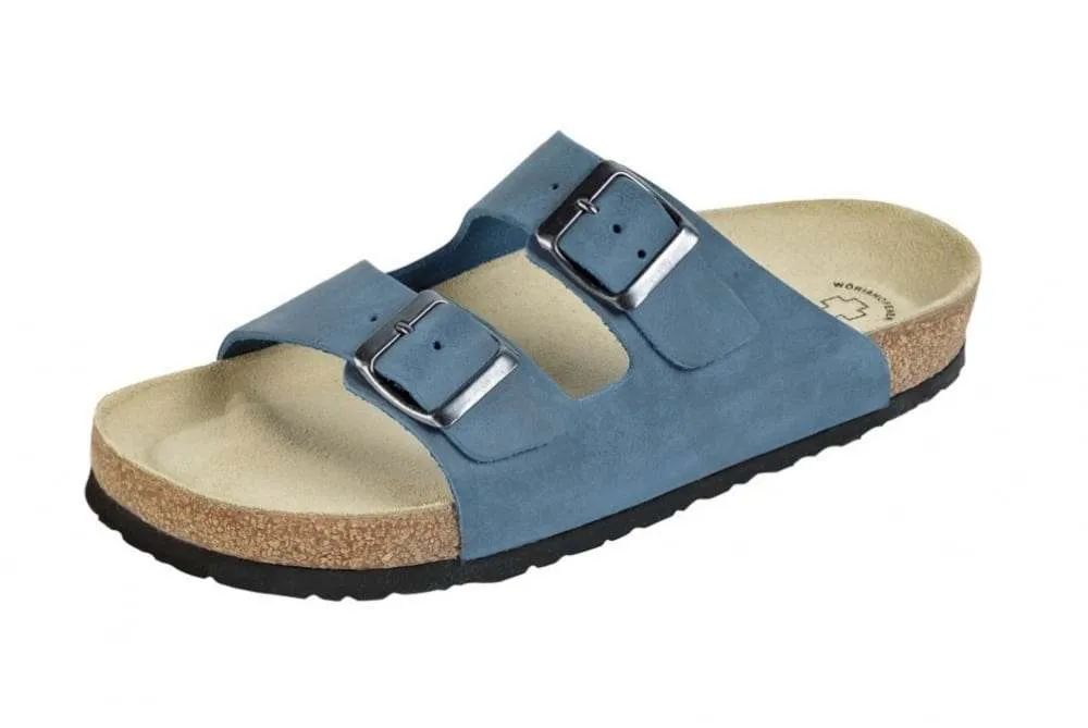 Weeger Bio-Pantolette mit breiter Bandage für Damen u. Herren – garantiert besten Halt, Naturkork-Luftpolsterfußbett, Lederdecksohle, Obermaterial in weichem Nubukleder , hochwertige Verarbeitung.